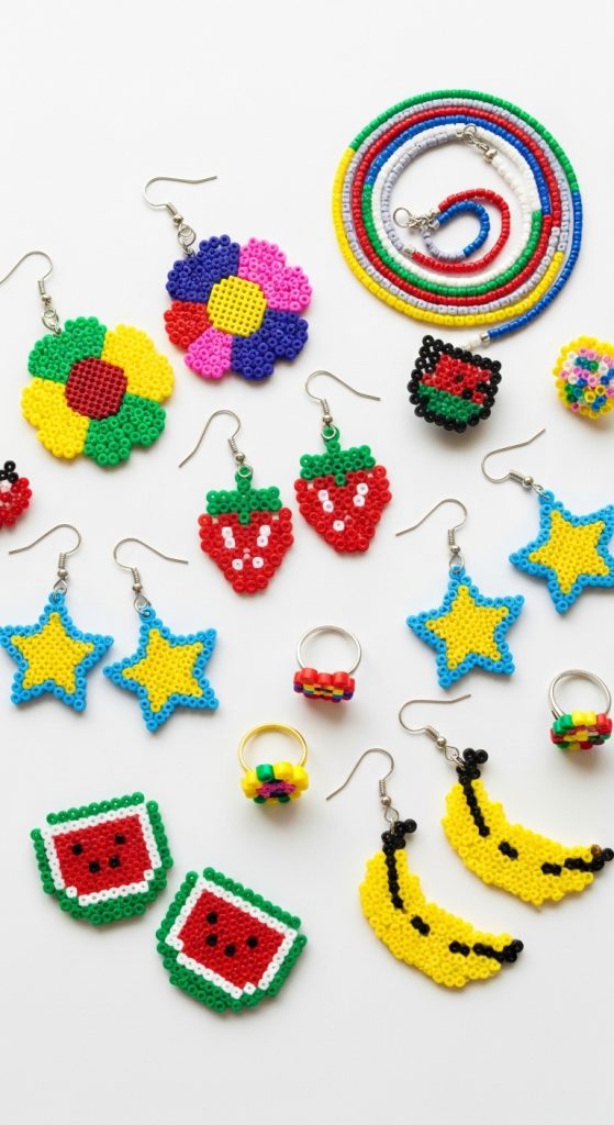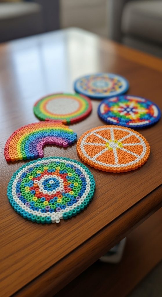 Practical and fun, Perler bead coasters can be made in patterns like rainbows, fruit slices, or geometric designs.
