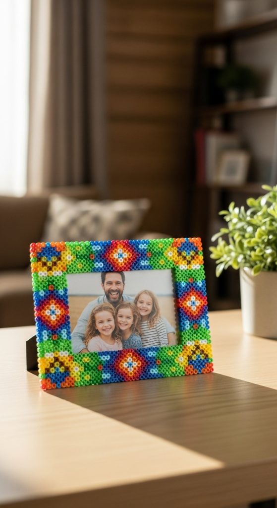 Build a border design from Perler beads and attach it to a small frame for a playful, handmade look.