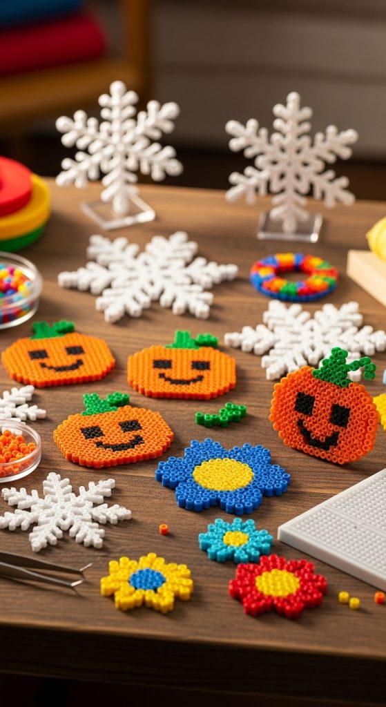 Make holiday-themed Perler beads—snowflakes for winter, pumpkins for fall, or flowers for spring.