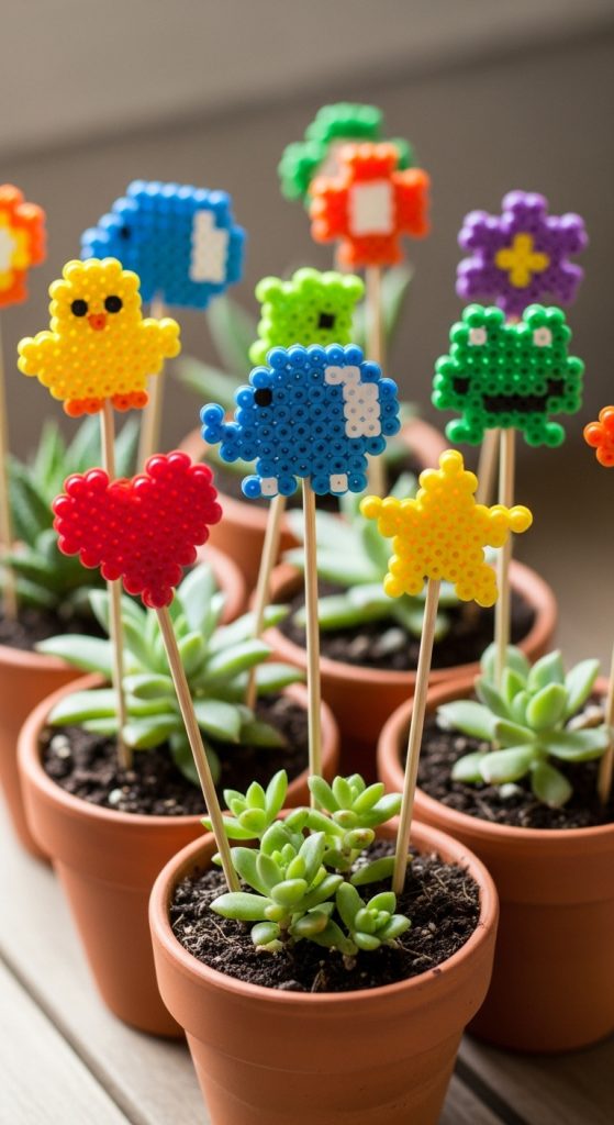Stick tiny Perler bead figures on skewers and place them into potted plants for a fun touch.