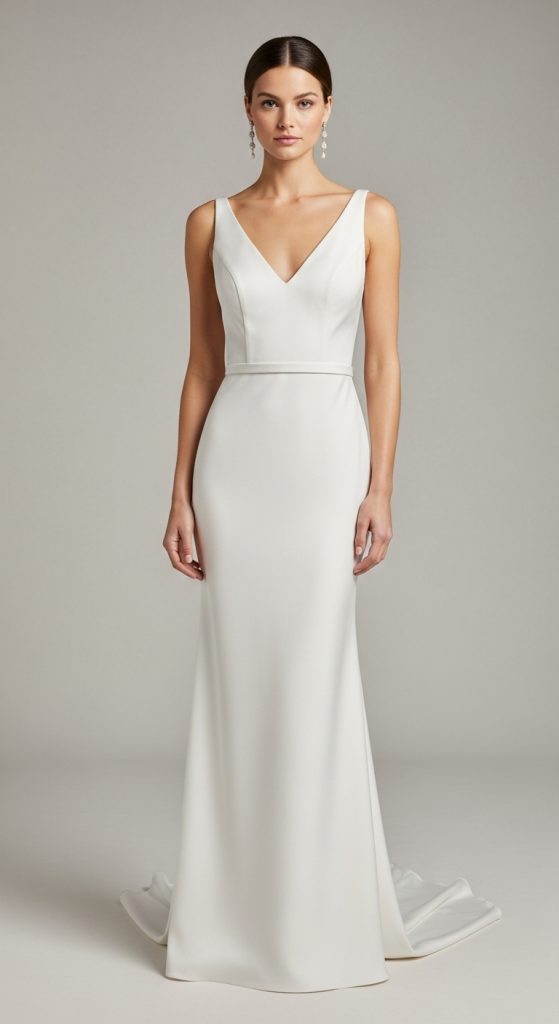 A minimalist sheath dress is perfect for a courthouse wedding, offering elegance without excess fabric or embellishments.