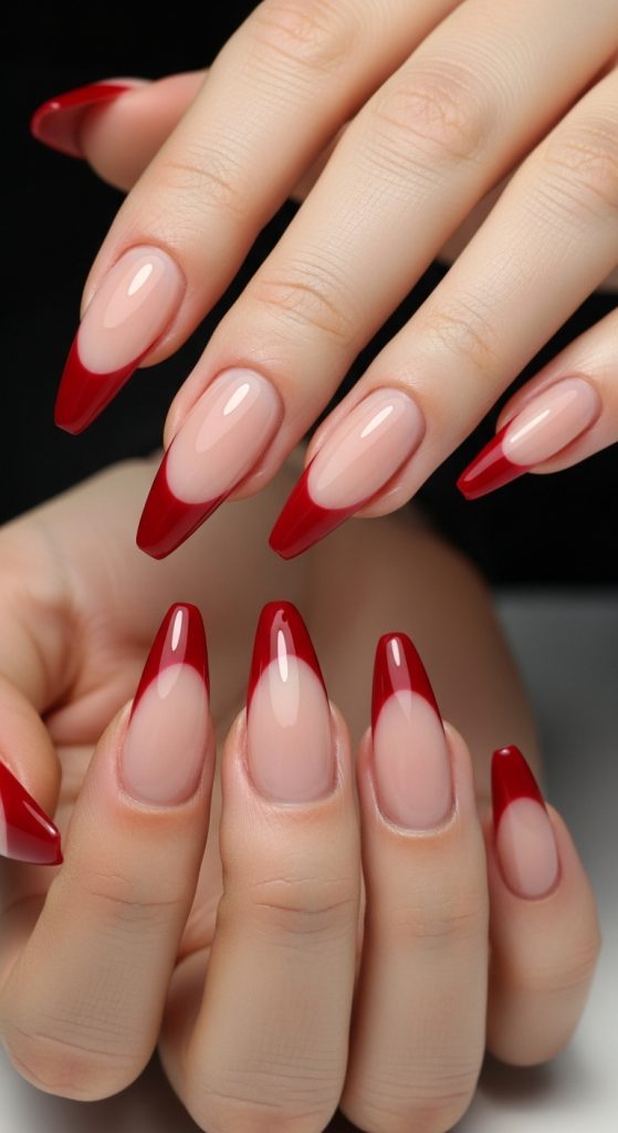 Nude or sheer nails with sharp crimson red tips are bold and sensual. This twist on the French manicure gives a dangerous, femme fatale aesthetic.