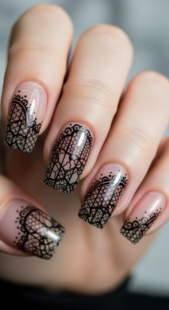 Black lace detailing over a sheer or nude base feels both sensual and commanding. This design mimics gothic femininity in a delicate yet striking way.