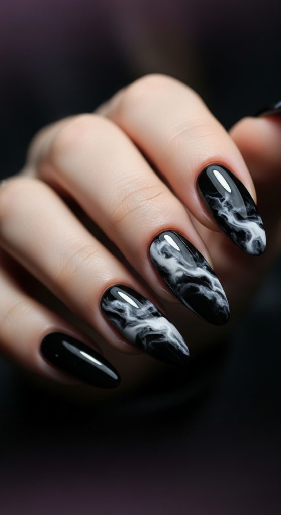 Black nails with white or gray marbling create a moody, artistic design. The pattern resembles stormy skies or smoky quartz crystals, symbolizing power and depth.