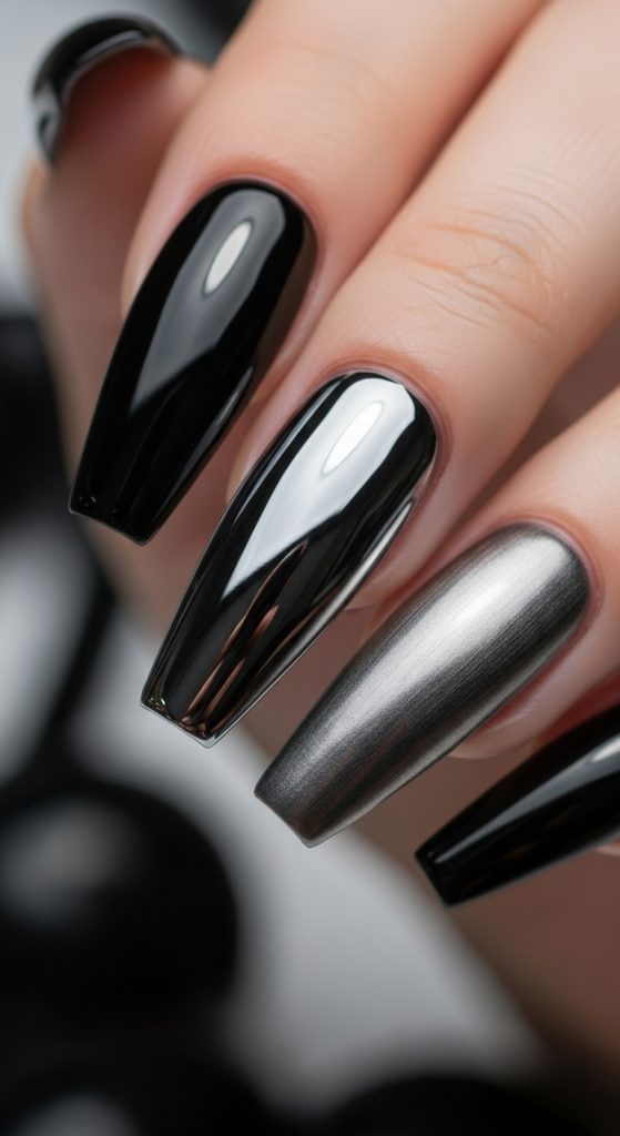 High-shine chrome nails in black or gunmetal shades give a futuristic and daring look. They’re edgy yet glamorous, ideal for dark feminine vibes.