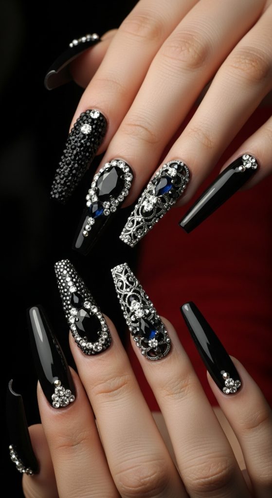 For the ultimate statement, long coffin-shaped nails with dark polish and strategically placed rhinestones or gems exude both elegance and dominance.