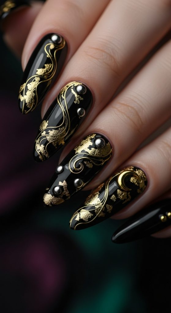 Dark feminine energy thrives in contrast. Black nails with delicate gold foiling, stripes, or flakes create a balance of darkness and opulence.