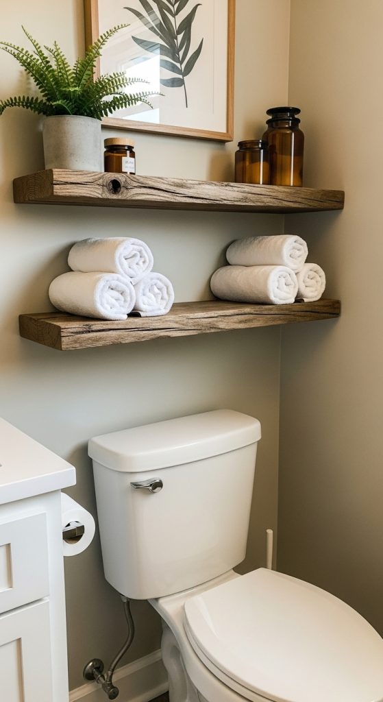 Why It Works: Adds storage + décor + vertical space