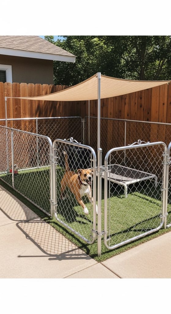Use basic chain-link fencing to build a simple rectangular run along a side yard or backyard wall. Add a gate for easy access and a shaded corner for rest.