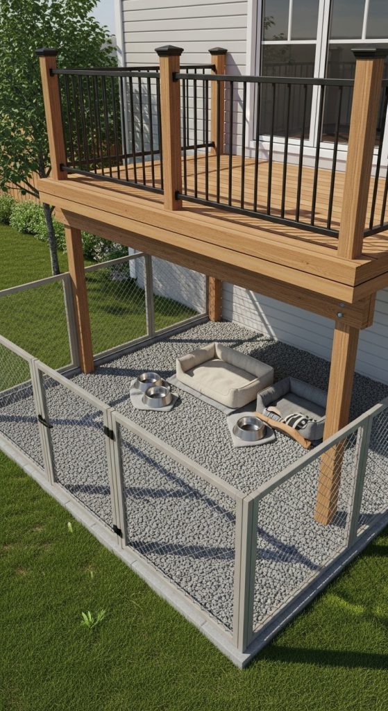 Utilize the underdeck area of your home as a shaded dog run. Add a small gate, install mesh along the perimeter, and line the floor with gravel or turf.