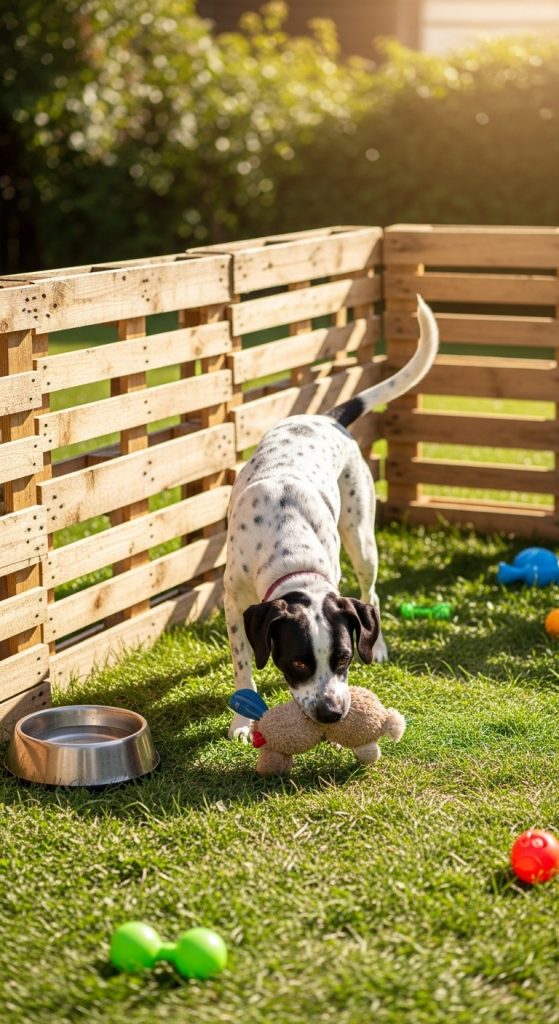 Upcycle wooden pallets by connecting them together to create a sturdy and rustic dog run. You can secure them vertically with posts or stack them horizontally.