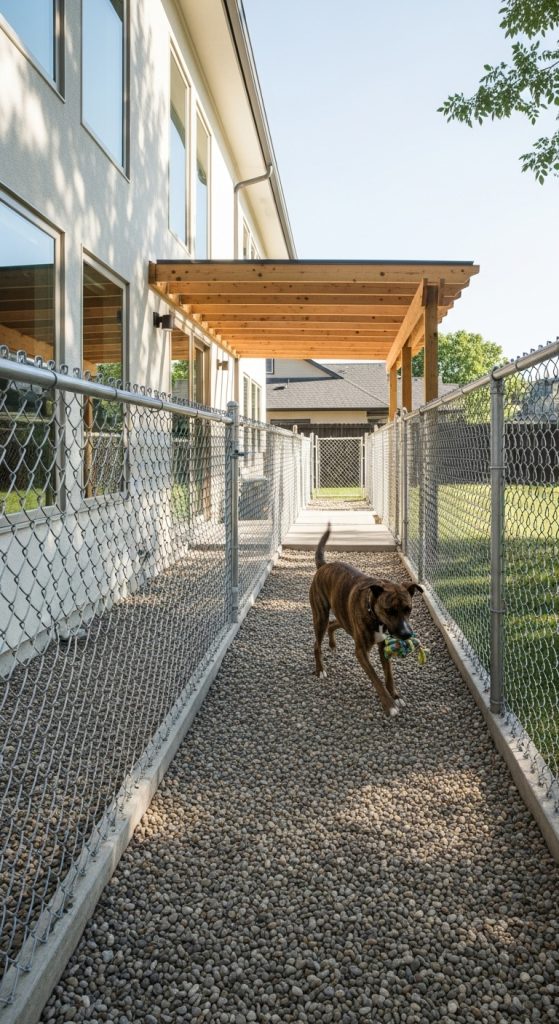 Use the narrow space beside your home to install fencing or wire mesh for a long, shaded dog run. Add artificial turf or gravel for comfort.