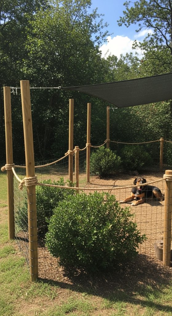 Drive tall wooden stakes into the ground and run rope or mesh between them to make a rustic, natural-looking run. Add landscaping or bushes for shade.