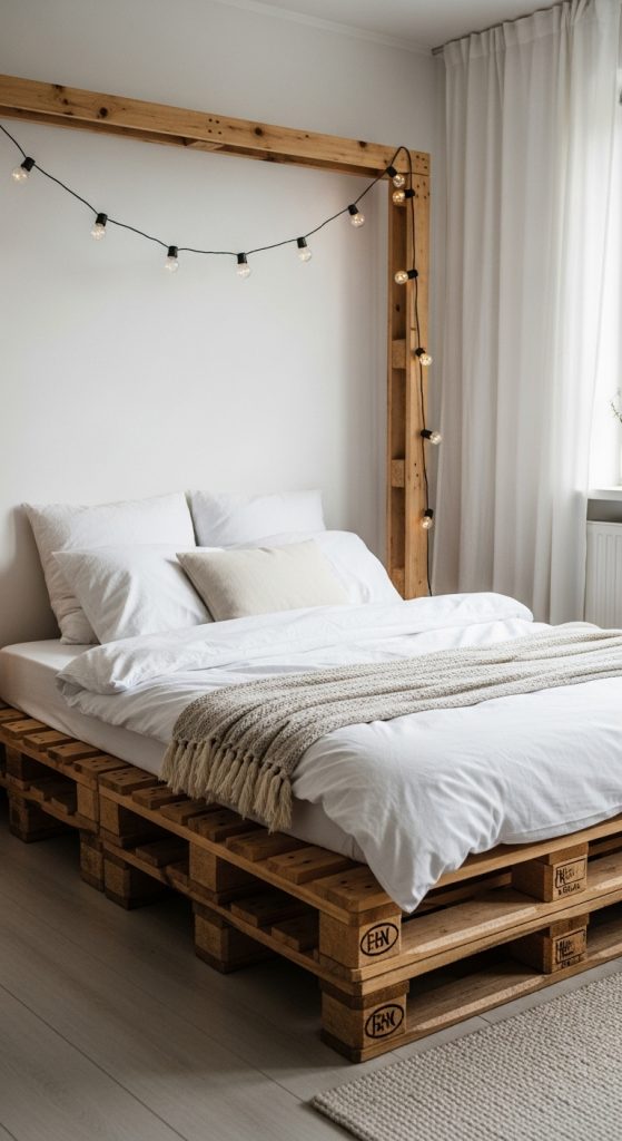 Repurpose shipping pallets into a minimalist bed frame. Sand them down for a smooth finish, paint or stain, and assemble as a platform for your mattress.