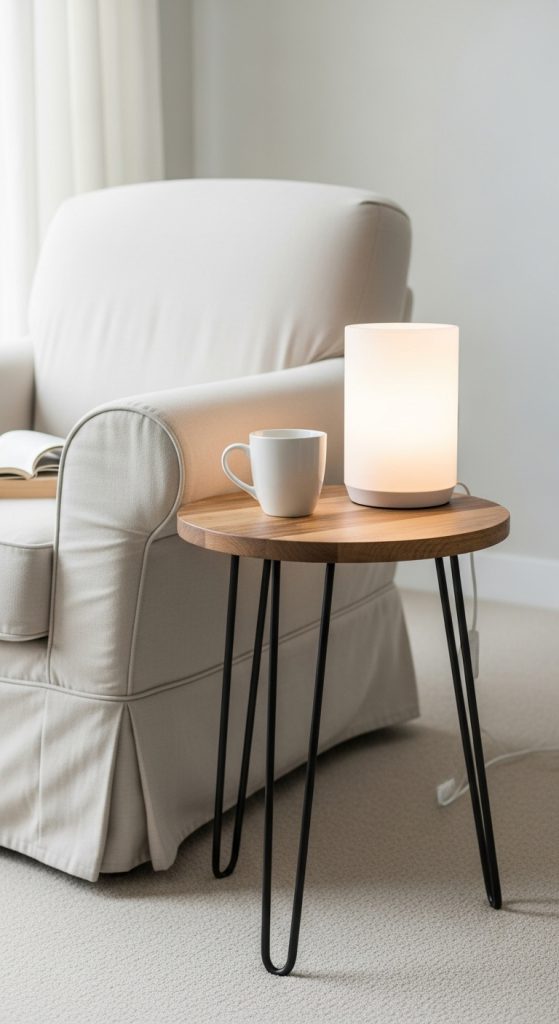 Create a sleek modern side table with a round or square wooden top and metal hairpin legs. Stain the wood for warmth or paint for a pop of color.