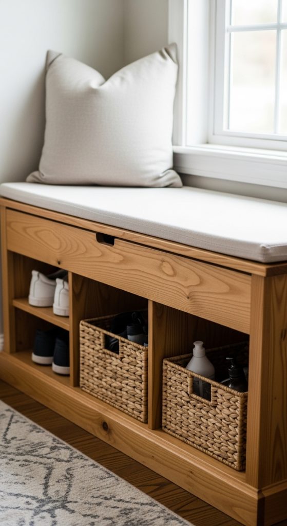 Build a wooden bench with a hinged top for hidden storage inside. Add a cushion on top to make it a comfy seating area.