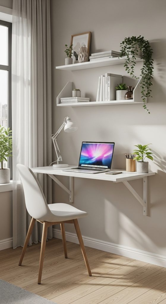 Perfect for small spaces, a floating desk can be mounted to the wall with brackets. Add a few shelves above for storage and decor.