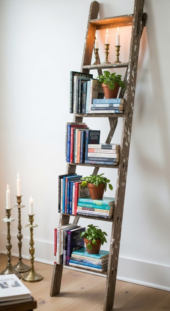 Transform an old wooden ladder into a rustic bookshelf by adding planks between the steps. Lean it against the wall for a functional and charming display.