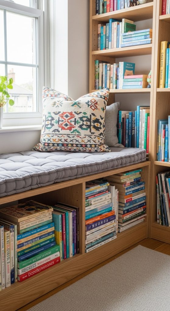 Combine a low bookshelf with a cushioned top to create a multipurpose bench. It saves space while adding charm to any room.