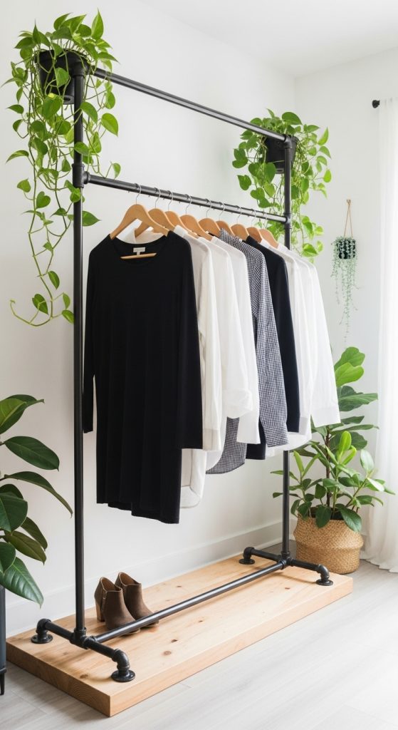 Build a clothing rack from industrial pipes and fittings. It’s easy to assemble and great for small closets, entryways, or minimalist bedrooms.