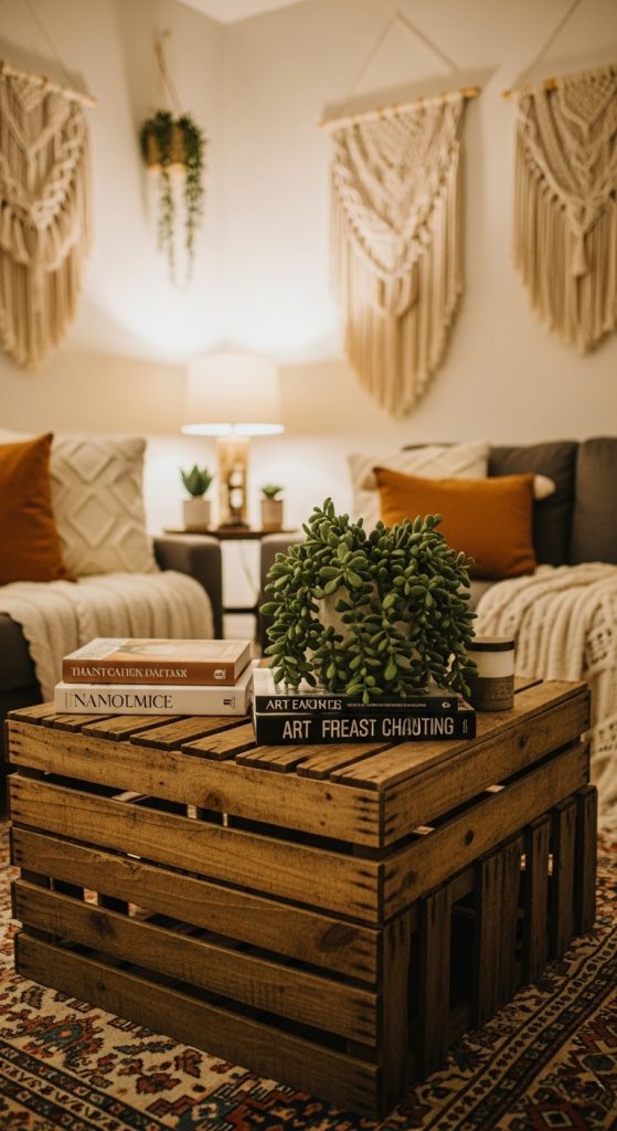 Stack and screw together wooden crates to create a rustic coffee table with built-in storage. Stain or paint to match your decor, and add wheels for mobility.
