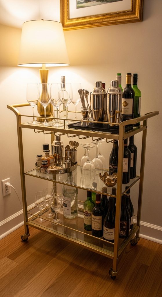 Convert an old metal or wooden shelf into a trendy bar cart. Add wheels, paint it metallic gold or black, and decorate with trays, glasses, and bottles.