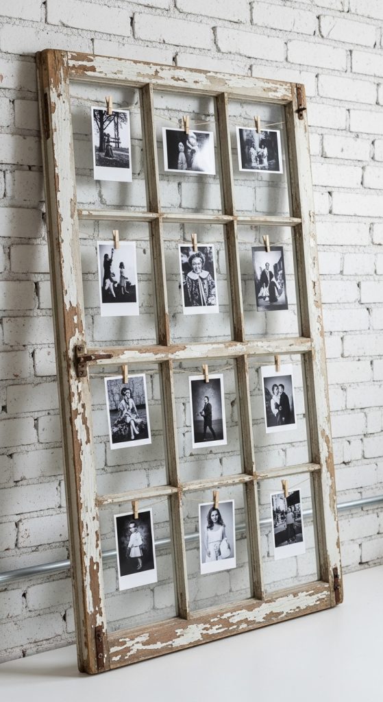 Repurpose antique window frames into unique rustic photo displays. Leave the original chipped paint intact for authenticity, or repaint in muted tones. Hang photos with clips or wire for a flexible, evolving gallery.