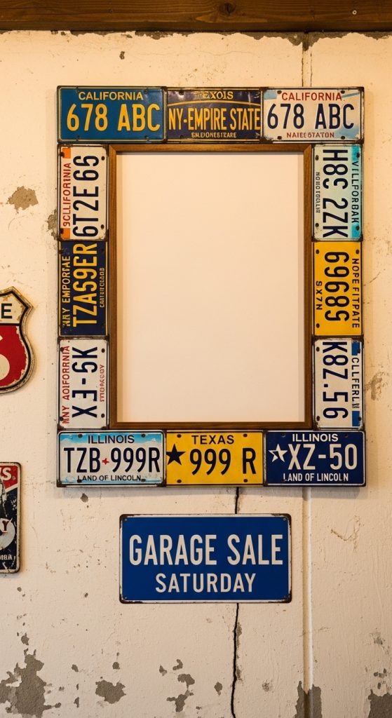 Upcycle vintage license plates into quirky rustic frames for car enthusiasts. Flatten and trim plates to fit around a standard frame, then attach with adhesive or bolts. This industrial decor idea suits garages, man caves, or retro-themed spaces.