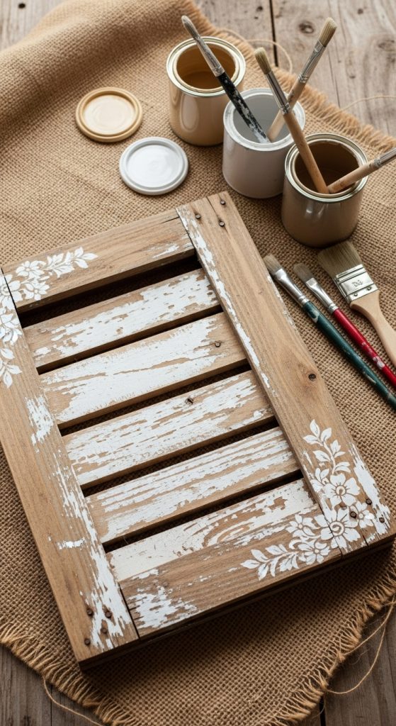 Upcycle wooden pallets into budget-friendly rustic frames. Pallet wood’s rough texture works beautifully with stenciled quotes, floral patterns, or geometric shapes. This idea merges farmhouse rustic style with personalized artistry.
