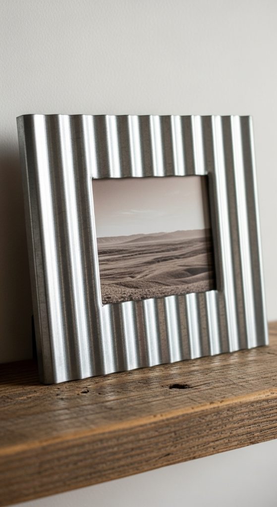 Corrugated metal sheets add industrial flair to rustic decor. Cut the metal to size, file sharp edges, and attach to a wooden frame base. Pair with sepia or monochrome prints for a vintage-industrial blend.