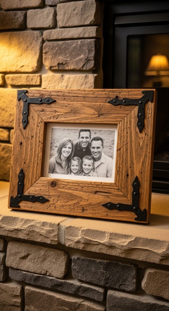 Sand edges to remove splinters, then assemble the frame using glue and clamps. Leave the wood unfinished for a raw look or seal it to enhance durability. Pair this DIY rustic decor with black-and-white photos for timeless appeal.