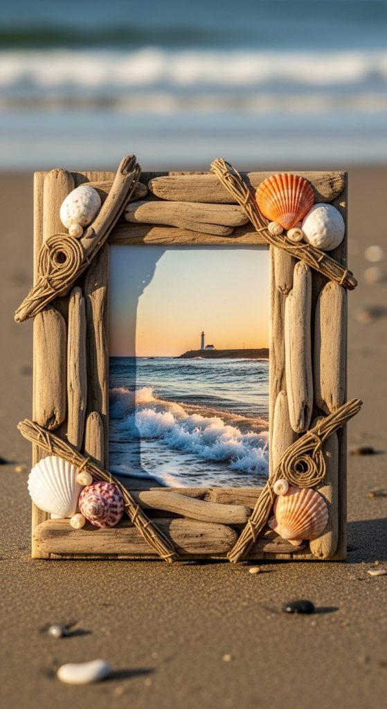 Arrange driftwood in overlapping layers for depth. Secure pieces with strong adhesive or small nails. Add jute twine or shell embellishments for coastal charm. Use keywords like “beach-themed frames” or “coastal rustic decor” for SEO.