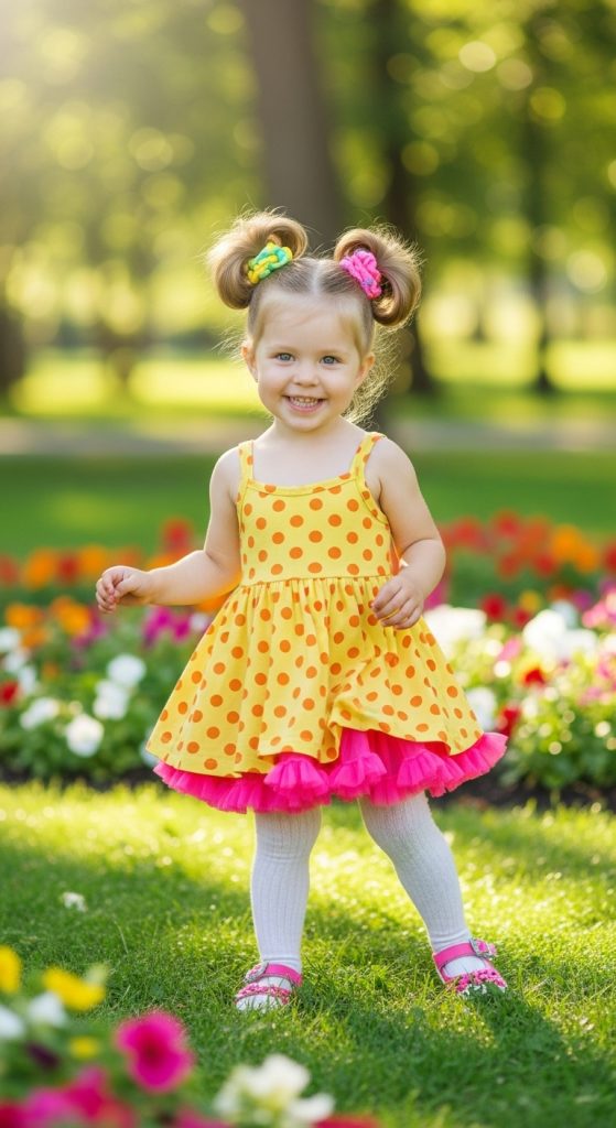 Split the hair down the middle and tie two high ponytails. It’s a classic look that’s energetic and playful — perfect for active little ones.