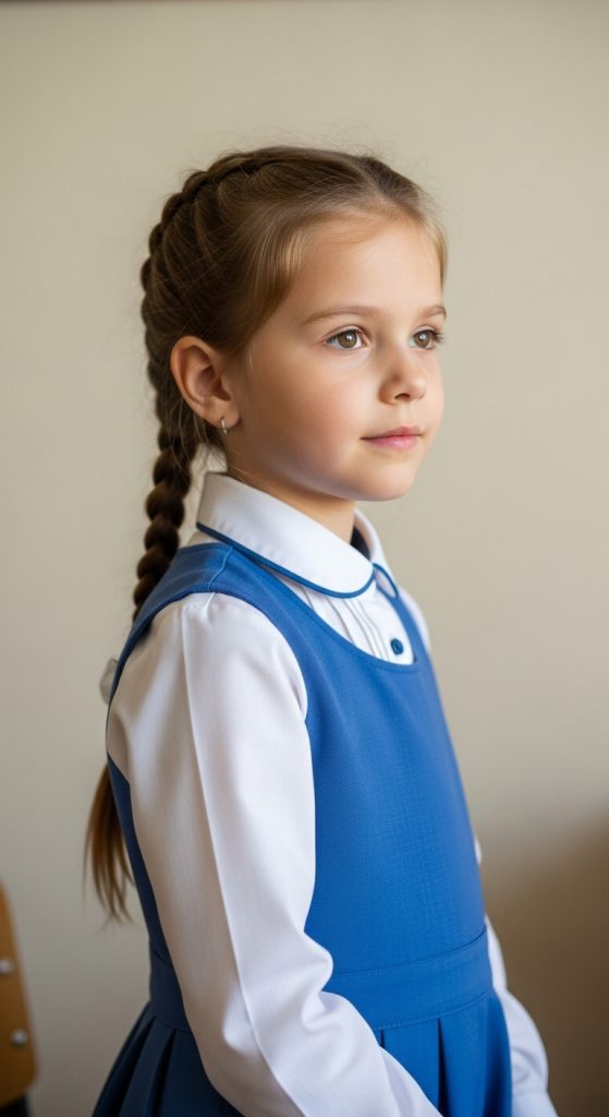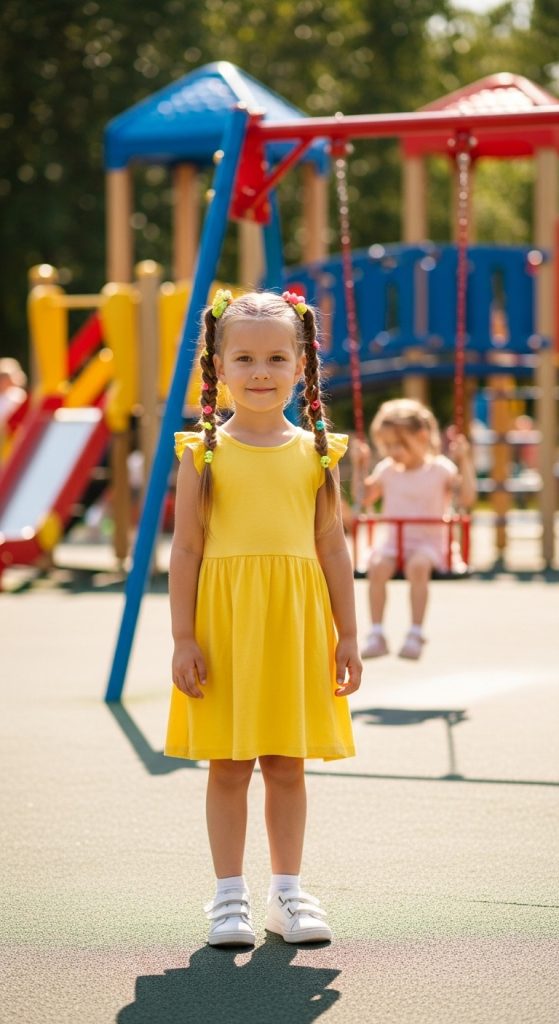 Two low pigtails braided for a tidy and sweet look. You can add ribbons or colorful hair ties for extra charm.