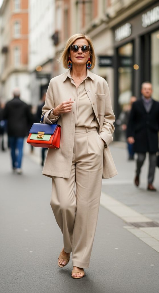 Wearing a single tone—like beige, gray, or navy—can be incredibly chic. Break up the look with bold earrings, a bright handbag, or printed shoes.
