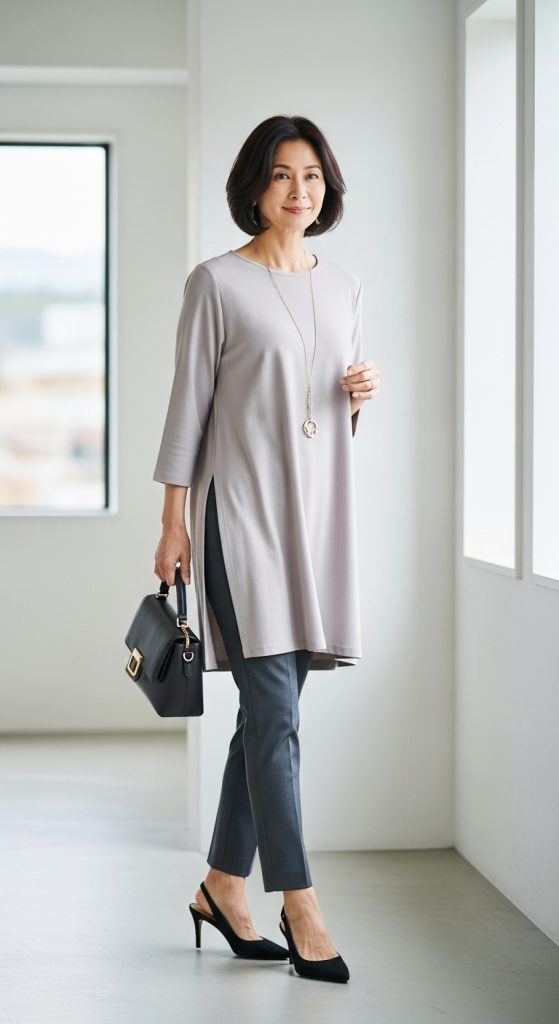 Tunic-length tops provide coverage while slim pants create a streamlined shape. Look for side slits or asymmetrical hems.