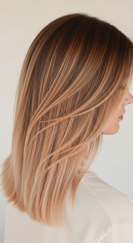 Balayage adds dimension to the color, giving it a natural, sunlit effect. Golden undertones at the ends paired with subtle strawberry roots make it low-maintenance yet striking.