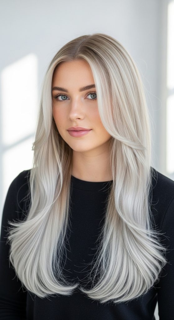 A cooler take on this warm shade, with icy highlights layered over golden-strawberry roots. Ideal for winter-inspired transformations with a frosty twist.