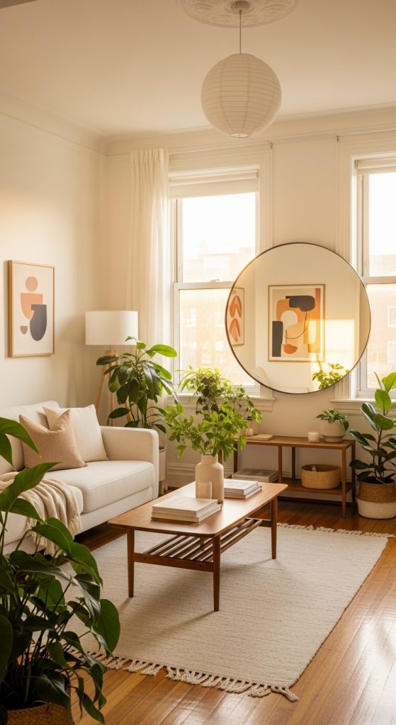 Mirrors are a classic apartment hack. Hanging a large mirror opposite a window instantly reflects light and gives the illusion of more space. You can even lean a full-length mirror against the wall for a casual-chic vibe.