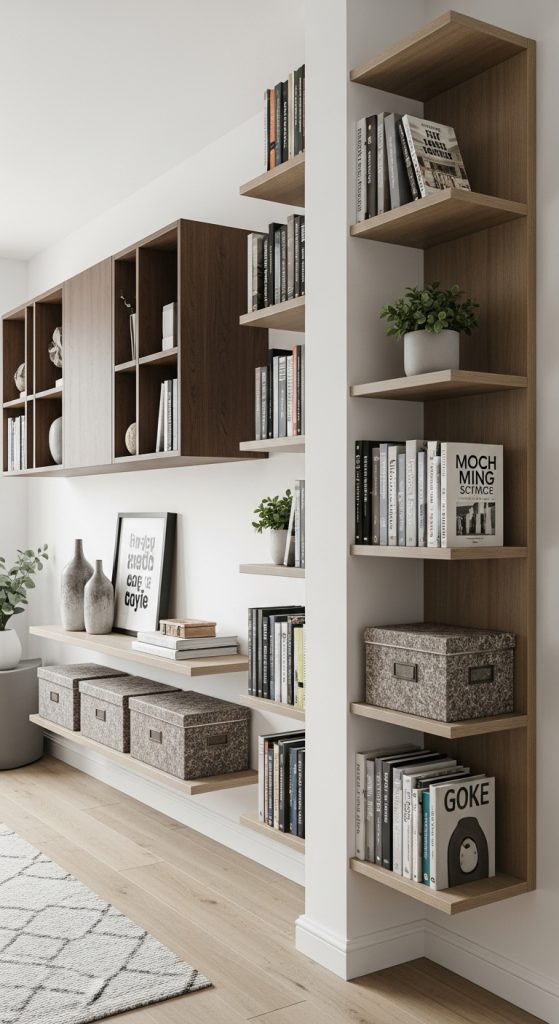 When floor space is limited, go up! Install floating shelves, wall-mounted bookcases, or vertical storage towers to hold plants, books, and décor. This draws the eye upward, making the room feel taller and more expansive.