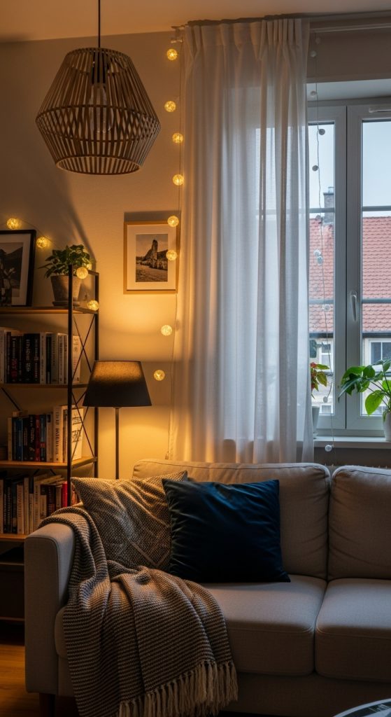 Skip heavy drapes in favor of light-filtering curtains or sheer panels to let in as much natural light as possible. If your apartment lacks good windows, layer lighting with floor lamps, sconces, and table lamps to create a warm, welcoming glow.
