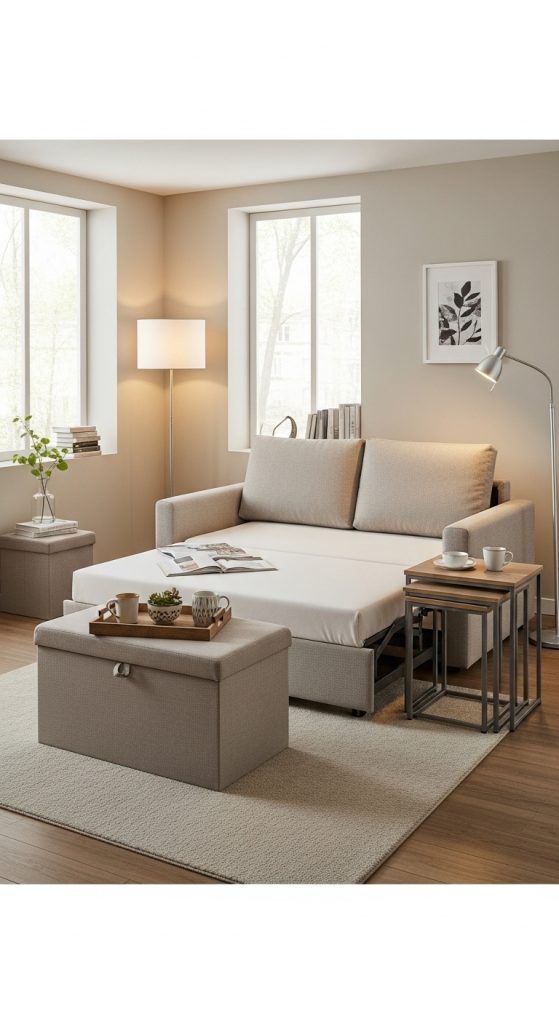 Think smart and choose pieces that do double duty. A sleek storage ottoman can act as both a coffee table and a spot to hide blankets. A sofa bed can accommodate guests, and a nesting table set saves space when not in use. In small apartments, furniture that works harder makes a big difference.