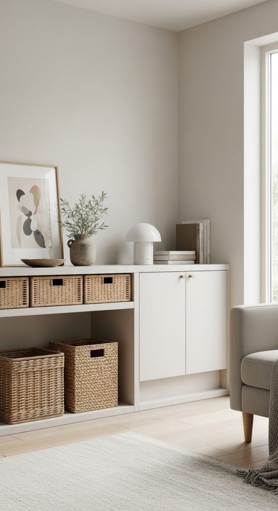 Make organization beautiful. Use baskets, fabric bins, or built-in cabinetry to tuck away clutter like remotes, cords, magazines, or extra pillows. A clean and tidy space feels larger, calmer, and more inviting—especially in a compact living area.