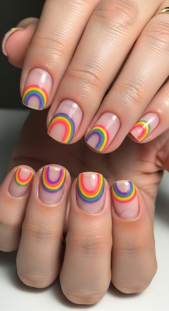 Small rainbow arcs (like mini rainbows) painted on a clear or nude base, leaving some natural nail visible.
