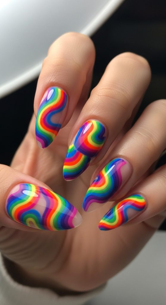 Wavy swirl patterns with rainbow colors flowing across nude or clear nails.