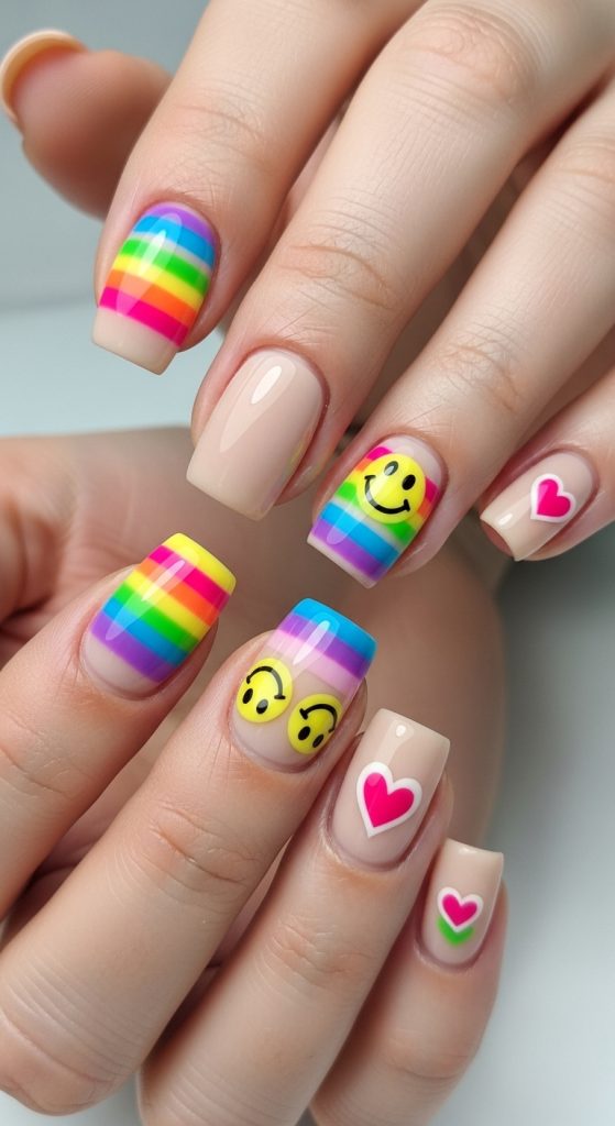 Most nails in a neutral or single color, with one or two accent nails painted in rainbow designs — stripes, hearts, or smileys.