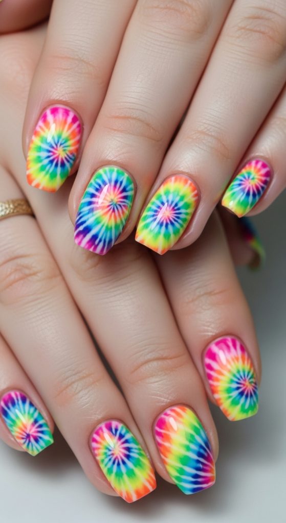 Tie-dye-inspired swirls and splotches in rainbow tones, creating a dreamy watercolor effect.