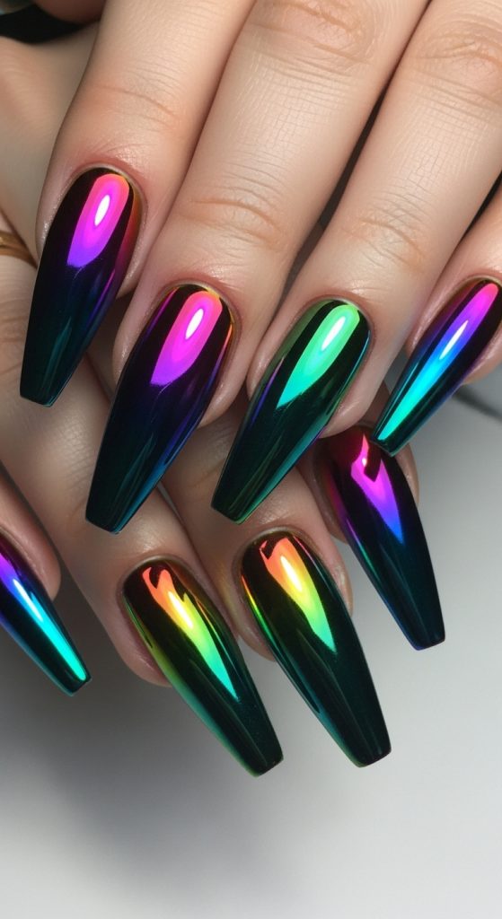 Metallic rainbow or oil-slick chrome finish over full nails, shifting color depending on the light.