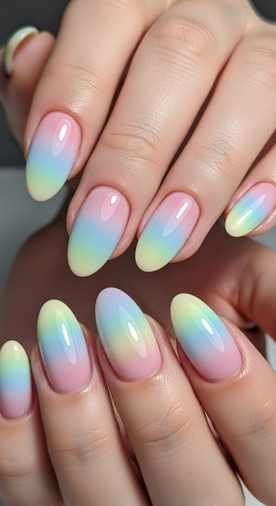 Soft ombré blending pastel rainbow shades across each nail or through a single gradient.