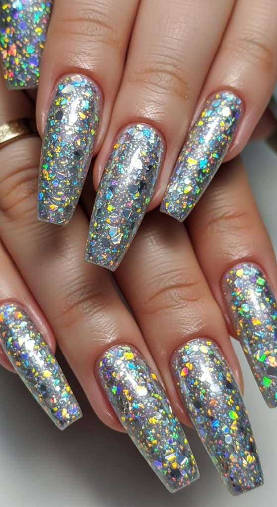 Full glitter nails in rainbow colors, either as solid coats, glitter gradients, or mixed holographic flakes.